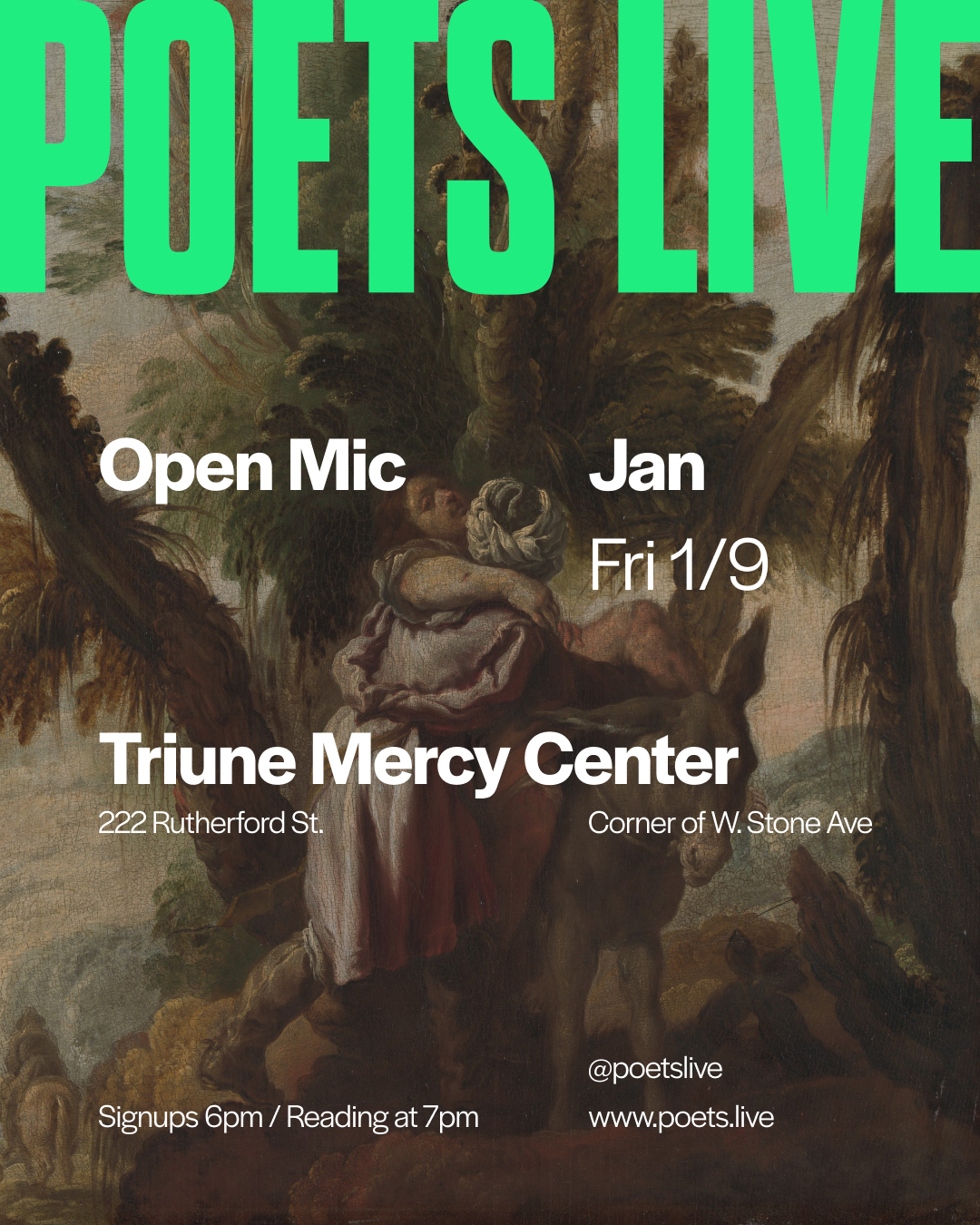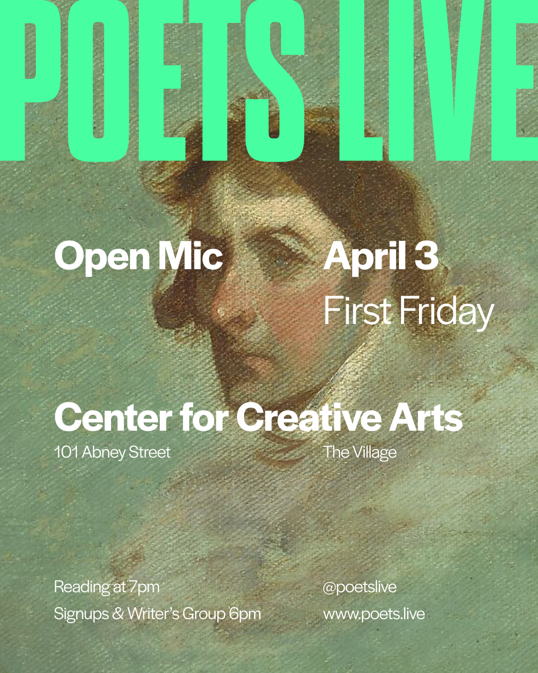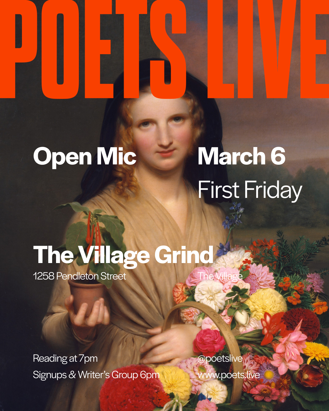 Open mic for poets of all ages and experiences. Signups start at 6pm. Readings from 7–8:30pm.